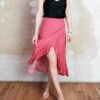 Der Rock wird direkt auf Taillenhöhe gebunden. Durch die Volants und den leichten Viskosestoff schwingt der Rock in der Bewegung wunderbar mit.