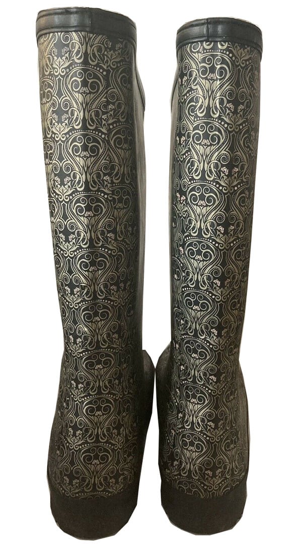 Moov-Stiefel sind keine gewöhnlichen Gummistiefel. Sie sind mit Stil und Flair gestaltet und an die Konturen Ihres Beins und Ihrer Füße angepasst. Sie sind mit 100% Merino-Schaffell gefüttert. Diese Moov-Stiefel halten Sie auch bei kaltem Wetter warm. Benannt nach imaginären "Femme Fatales" verleihen die Dark Angels Moov Boots einen schwülen Stil, gemischt mit einem glamourösen Goldmuster