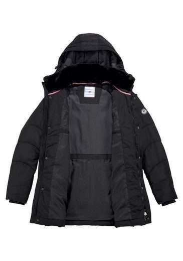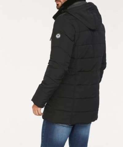 Das leicht schimmernde Obermaterial bekommt durch kleine Kontrastdetails an den Zippern und den kuscheligen Fellimitatkragen sowie lässiges Steppdesign eine edle Note.