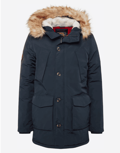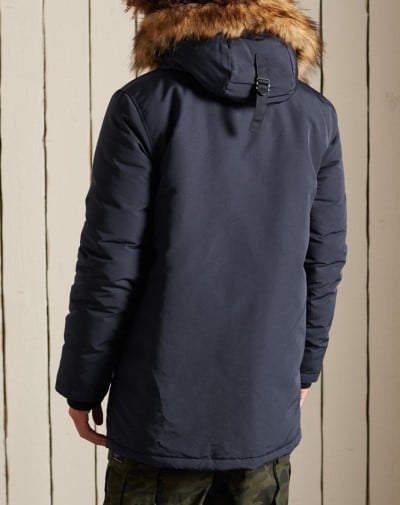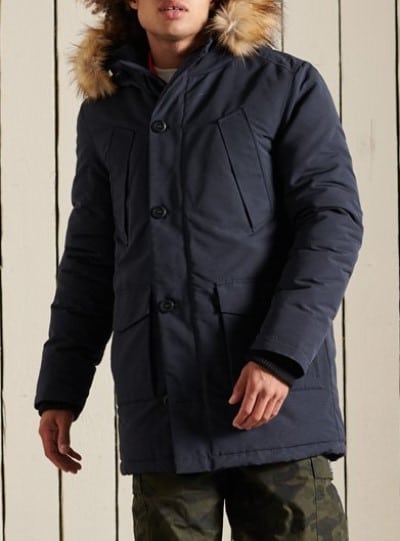 Der Parka von Superdry verfügt über einen Hauptverschluss mit Reißverschluss und einer Knopfleiste, einer Kapuze mit Kunstfellbesatz und 4 Taschen.