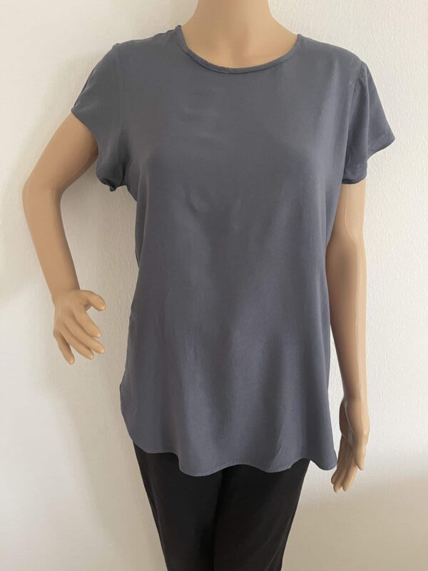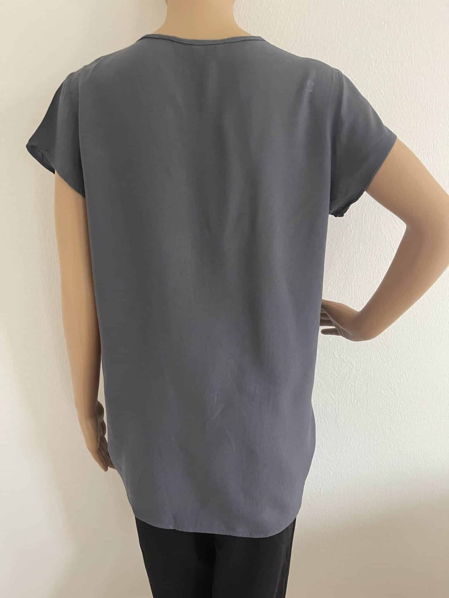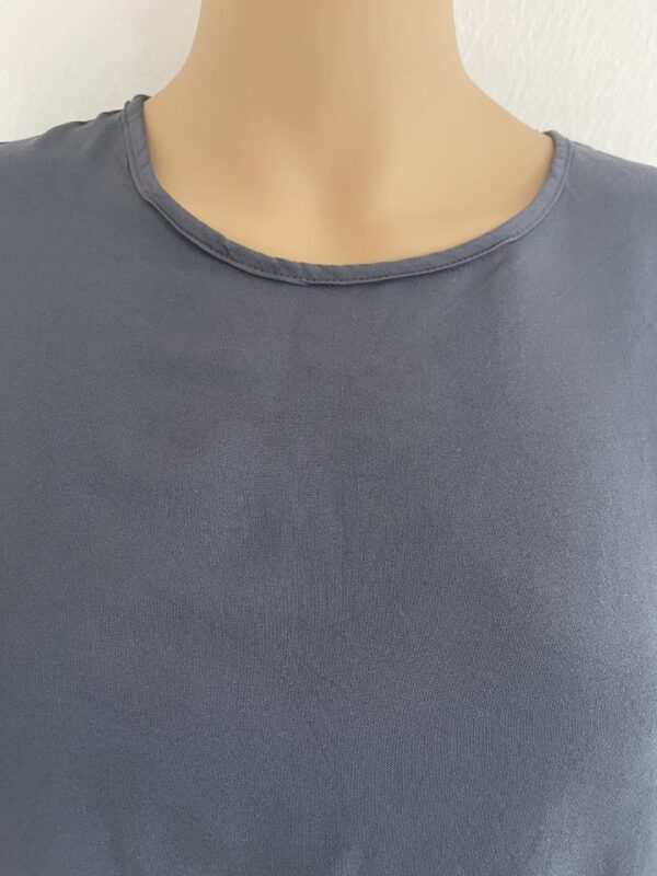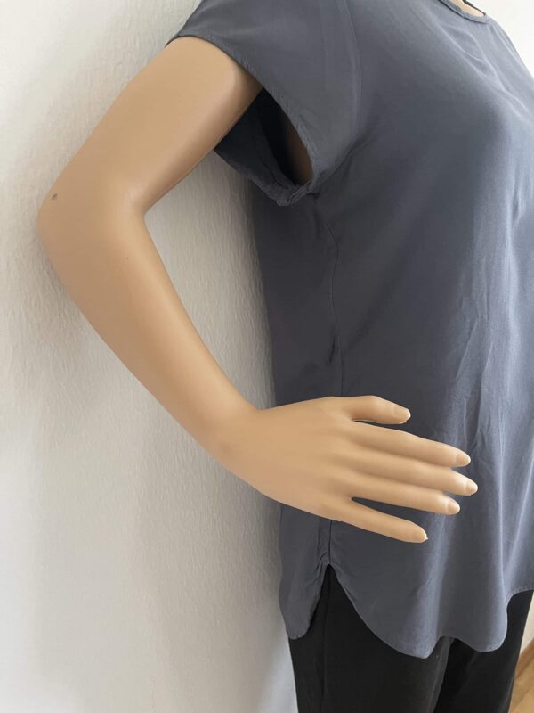 Das Blusenshirt hat einen leichten, kühlen Griff, Ton-in-Ton-Nähte und einen abgesteppten Saum.