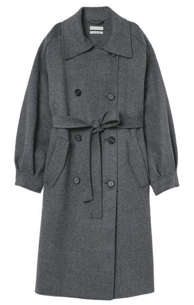 - Modell mit Kragen, Revers und einem breiten abnehmbaren Bindegürtel in der Taille